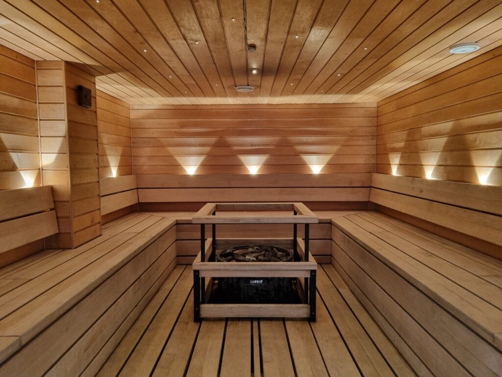 A modern sauna that can accommodate approximately 15 people at a time. The dressing room and under the sauna benches are equipped with audio equipment, which is controlled through the amplifier unit in the dressing room using AUX and Bluetooth connections. The dressing room also has its own refrigerator.