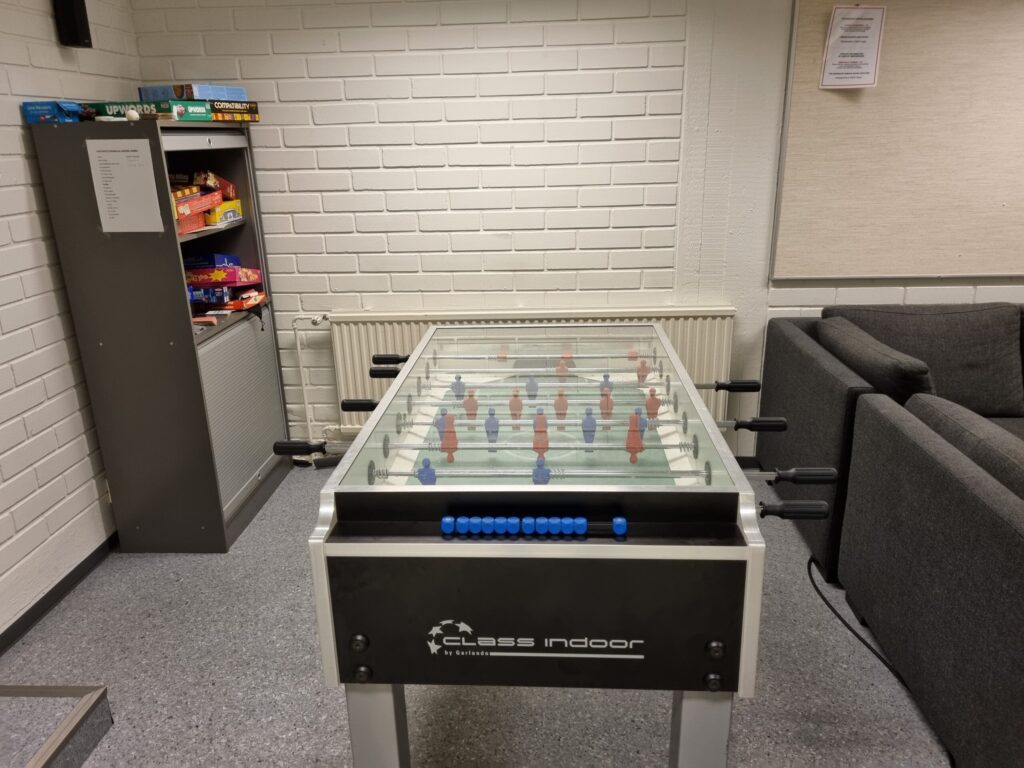 Video projector and screen, home theater-quality audio equipment, sofa for 8+ people. Foosball, speed game and board games. Well-equipped kitchen (fridge, stove, microwave, coffee maker, kettle, dishwasher). Dining tables, chairs, and basic tableware for 32 people.